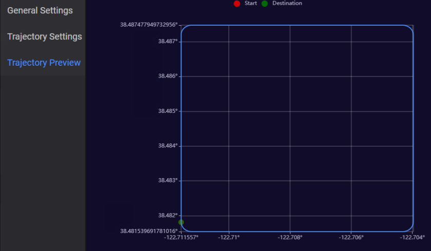 Trajectory Preview - This tab provides a visual preview of the trajectory that you defined in the Trajectory Settings. The start and destination points are clearly marked in this view to indicate the beginning and end of the trajectory. The following is a sample trajectory preview when the Shape is set to Rectangle in the Trajectory Settings tab.