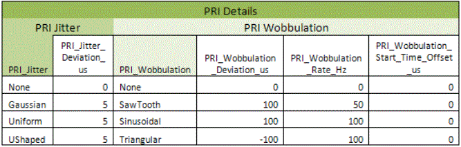 The PRI pattern can be combined with PRI Jitter and PRI Wobbulation. The PRI Wobbulation Rate is imported and exported in Hz. The default value for PRI Jitter and PRI Wobbulation is none.