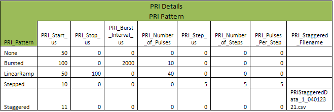 These subsections are shown in the CSV file example screens below. The PRI pattern properties enable you to vary the signal repetition interval in both random and deterministic ways. The PRI pattern can be applied to either a pulse object type or a pattern object type. The PRI Start value maps to or from the Repetition Interval property and to the first item in the Staggered PRI list. The default value for PRI Pattern Type is None.