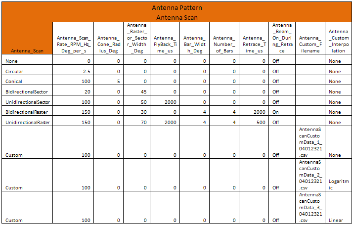 The Antenna Pattern properties are organized into the following four subsections (also shown in the CSV file examples below).