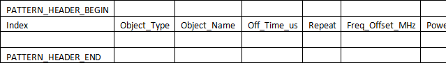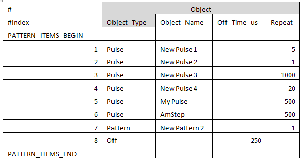 The Object properties are organized as shown in the Object example below appearing in the columns after the Index header. The properties in this section include the object type to generate, the object name, the off time in us, and the number of times to repeat the object. Valid objects include pulses, patterns, and off time. When the object type is off, all other values in the row are ignored except for the Off_Time_us, which is used for the off time length. If the object type is Pattern, an empty pattern is created unless a pattern with the specified name already exists in the Pattern Library.