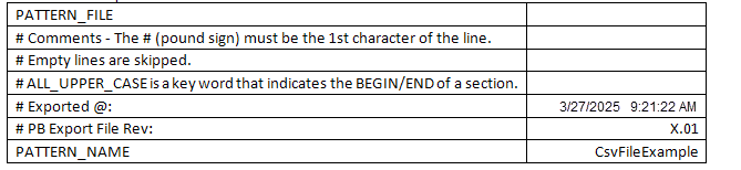 The CSV file must start with the PATTERN_FILE keyword and contain PATTERN_NAME, which is the name of the imported pattern. Additional comments may be added as needed and must begin with the symbol # as the first character in the row.