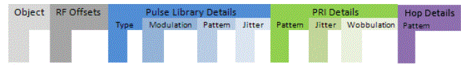 For details about the pattern header organization and their associated values, see Object, RF Offsets, Pulse Library Details, Hop Details Antenna Pattern Details, and PRI Details sections.