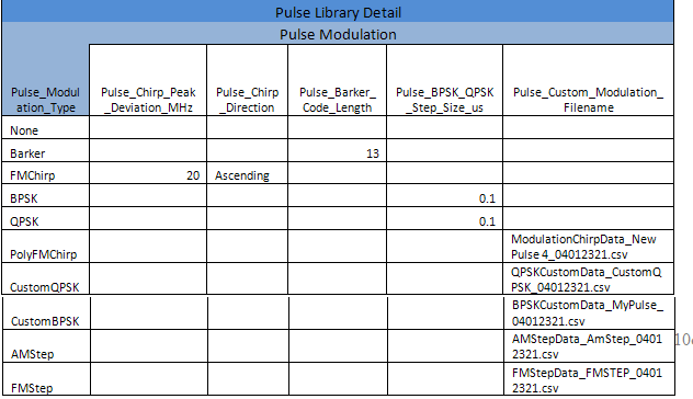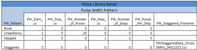 Individual entries for frequency values should be entered in MHz and time values should be entered in microseconds (us) unless specified otherwise by the Pattern Header item. Example: the value for PRI wobbulation rate is in Hz since its associated Pattern Header item is PRI_Wobbulation_Rate_Hz.