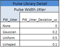 The properties shown in the Pulse Width Pattern example below enable you to vary the pulse width in random or specific ways. The pulse width pattern is only available when Pulse Type is Trapezoidal or Raised Cosine. The pulse width pattern can be combined with Pulse Width Jitter. The default Pulse Width Pattern is none.