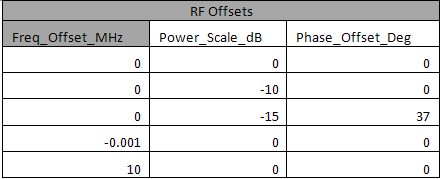 The RF Offsets properties are organized as shown in RF Offsets example below. These properties are offsets that are applied to the RF output using I/Q modulation. The offsets include Frequency Offset, Phase Offset, and a Power Scale. The offsets for a given line are relative to objects in other lines as well as to the RF frequency and the RF amplitude. The offsets are applied to all objects specified by the number of repetitions. The offsets are additive, so if the Power Scale is set to -10 dB, and an antenna scan is applied to 1000 pulses, the amplitude for each pulse produced by the antenna patterns is reduced by 10 dB. With the Power Scale set to 0 dB, the maximum possible amplitude from the antenna pattern is 0 dB.
