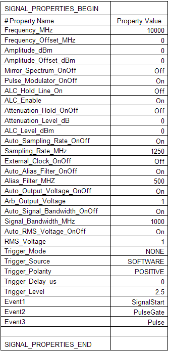 The first section following the file header is Signal Properties. It contains the signal properties located in the Pulse Building Pattern Library form in the Pattern Details area's Advanced view. The Signal Properties section must begin with the keyword SIGNAL_PROPERTIES_BEGIN and end with the keyword SIGNAL_PROPERTIES_END. The signal properties include the following: