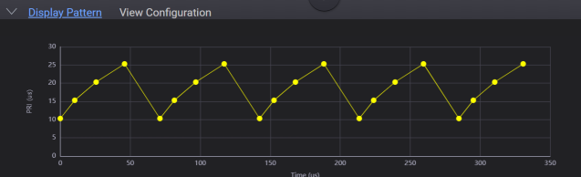 Provides a plot of the PRI pattern data, including the jitter and wobbulation impairment, if specified. The plot shows PRI versus time. The plot is based on the current PRI Pattern properties. You may zoom in on the PRI pattern plot by clicking and dragging across the area of interest.