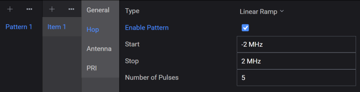 Enable Pattern allows you to easily disable the current PRI pattern without setting the PRI pattern type to None. This preserves your entries for the pattern. Changing the PRI Pattern type causes PRI pattern properties to be reset to their default values. PRI Wobbulation and PRI Jitter are also disabled when the PRI Pattern is disabled.