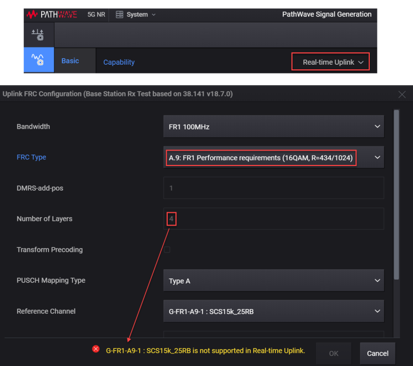 If the Capability is set to Real-time Uplink, the FRCs with 4 Number of Layers are not supported. In such a situation, if you try to select an FRC with 4 Number of Layers, an error is displayed as shown below.