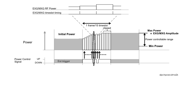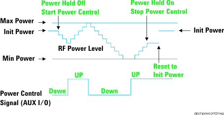 Figure 2 illustrates the DPCH power control using an external signal. When the Power Hold State is turned off, the instrument's output responds to the power control trigger signal. The transmit power control signal is sent from the base station and indicates whether to increase or decrease the power level. Increases and decreases are done in increments of the specified Power Step. Once the power level has reached the specified Maximum Power, signals requesting an increase in the power level will be ignored (the power is clipped to Maximum Power).