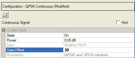 It is generally recommended that a small data offset (for example, 10 symbols) is used between carriers. This can be set in the Continuous Pattern node, as shown below. The continuous pattern setting is the correct one to use for component test. It ensures that the modulation is changing throughout the GSM/EDGE frame, and enables you to quickly verify the response to different modulation, spectrum, and amplitude conditions.