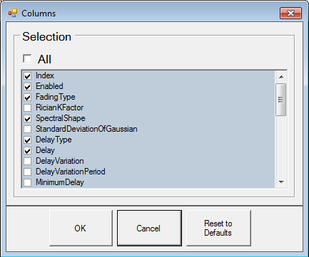 Restores the standard path settings in the active fader path pane for the selected channel model. (Applying this button restores all Fader Paths to their default settings.) It also restores the default settings for the carrier frequency and the random seed.