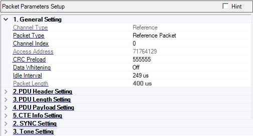 Double-click or use the drop-down menu to set the whitening state of the PDU and CRC data of Bluetooth low energy wireless technology packet.