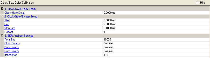 If the delay parameter is unknown, the Clock/Gate Sweep Setup menu is used to configure the calibration utility, Once configured, the calibration utility generates a plot of BER versus clock/gate delay. From the plot, the correct clock gate delay setting to realign the signals at the input of the BER analyzer can be determined.