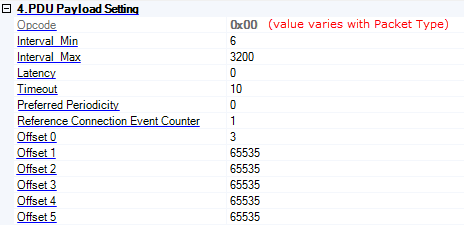 Set to indicate the possible values of the position of the anchor points of the LE connection with the updated connection parameters relative to the ReferenceConnEventCount. Offset0 to Offset5 fields are in units of 1.25 ms and are in decreasing order of preference, that is, Offset0 is the most preferred value followed by Offset1 and so on. Offset0 to Offset5 shall be less than Interval_Max. A value of 0xFFFF(65535) means not valid.Valid Offset0 to Offset5 filds shall contain unique values. Valid fields shall always be before invalid fields.