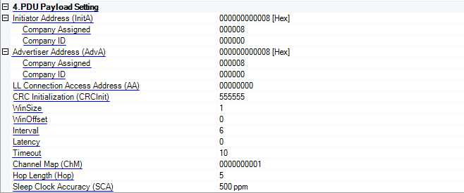 Double-click or use the drop-down menu to select the sleep clock accuracy of Bluetooth low energy wireless technology packet.