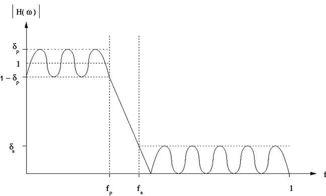 Set the parameters to design a Parks-McClellan low pass filter in the menu below. The Parks-McClellan design method uses the Remez exchange algorithm to design linear phase FIR filters such that a filter has minimum weighted Chebyshev error in approximating a desired ideal frequency response. For more details, refer to Chapter 7.4.3 in "The Parks-McClellan Algorithm in Discrete-Time Signal Processing, 2nd ed".