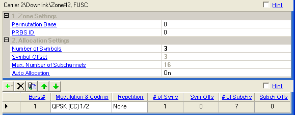 Select whether the bursts will be automatically generated (On) or manually allocated (Off). With auto allocation on, the software will configure the bursts based on the number of assigned slots and maximum number of subchannels available in the zone, avoiding any burst overlap where possible. Selecting auto allocation off activates the symbol and subchannel offsets in the burst editing window which can be edited for manual burst allocation.