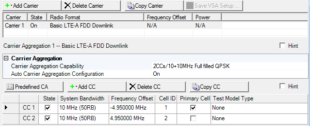 The Carrier Aggregation node is composed of a carrier aggregation configuration summary table that contains a list of the component carriers. Figure 1 shows these carriers as CC1 and CC2.
