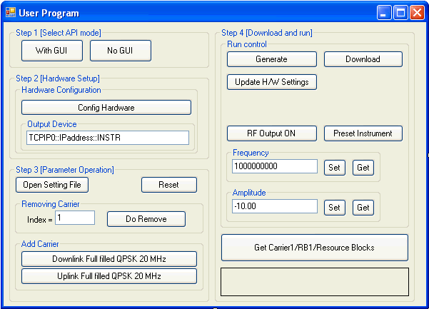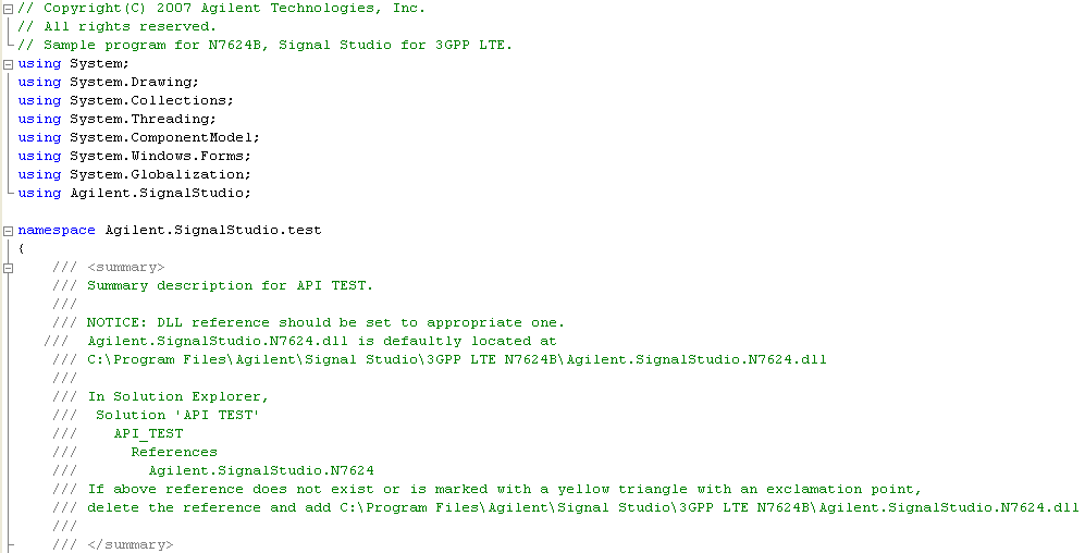 You can create an API program by performing the following general steps. This sequence is demonstrated in the Main.cs file (C:\Users\<my account>\AppData\Roaming\Keysight\Signal Studio\LTE-LTE-Advanced FDD\Samples\SimpleControl\Main.cs).