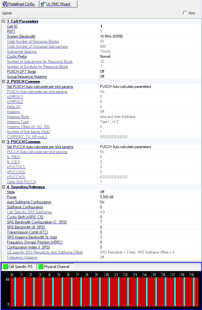 Click Uplink in the tree view to open this property grid, enabling you to set cell parameters and sounding reference signal parameters.