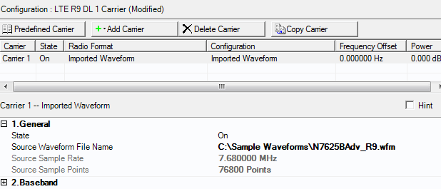 The General table in the Carrier n node enables you to turn the Imported carrier on and off, and select a saved channel configuration.