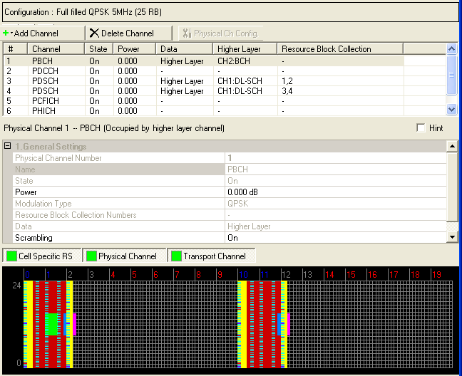 To add a new physical channel, click the Add Channel button, and select the physical channel type (PBCH, PDCCH, PDSCH, PDFICH, or PHICH) to add. The software adds the new channel above the currently selected channel in the list. The software assigns a channel identifying number to the new channel that corresponds to its position in the list and increments the identifying numbers of subsequent channels in the list.