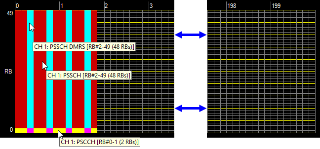 When you place the cursor over a collection of occupied resource blocks (any solid color), the associated channel and resource block information is displayed, as shown in Figure 1. Resource Block Collections below. Unoccupied resource blocks are dark and show the grid.