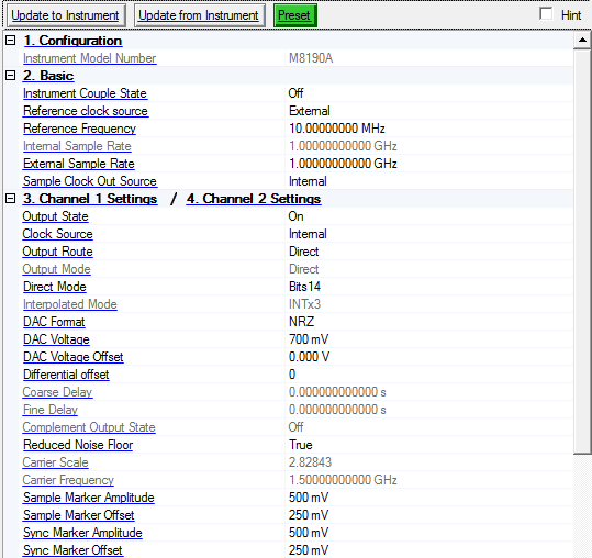 To access the instrument settings, click in the tree view. If there is more than one instrument connection, there will be a corresponding number of Instrument listings in the tree view. The figure below shows the Instrument property grid when connected to an M8190A AWG.