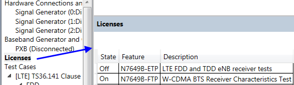 The License node (tree selection) displays what licenses are available and which licenses are installed. If a license is installed, its State shows On, otherwise the it shows Off. The following figure shows the node selection and its corresponding license view. In the Licenses view, it shows one license that is Off and another license that is On (installed on the PC).