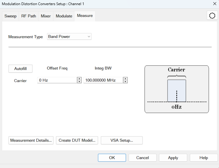 This dialog allows measurement set up on a 2-port DUT. Dialog for Modulation Distortion Measurement Class (MOD)