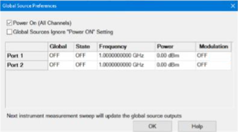 Global Sources Ignore "Power ON" Setting - This setting is a preference. Sources set to Global are not turned off when Power On (All Channels) is checked. Users of high power systems often turn off the RF Power to avoid damaging the system or the DUT. However, they may not want to turn off Global Sources being used as the clock signal for synthesizers.