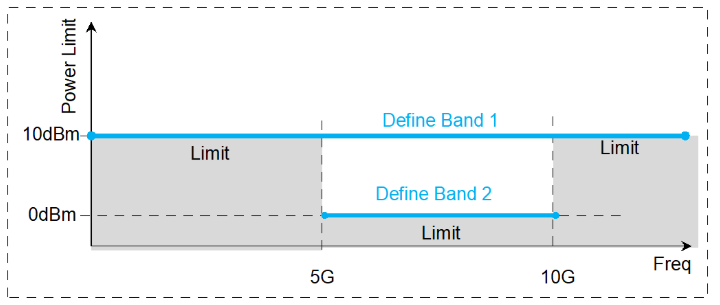 Notes: Each source has an independent set of bands, states, frequencies and power limits. Select Source Selects a source from the combo box. The default selection is the source which was chosen in the Offsets and Limits dialog. The Band Limits table is used to define the limits of the selected source. Changing to another source will display the Enable Banded Power Limits checkbox and Band Limits table for that source. User can make changes to those values. Not all External Source drivers are supported by the Power Limit feature. In particular, very old source drives with an "AG" prefix are not supported and limits cannot be set. Enable Banded Power Limits When enabled, the limits will be applied to the selected source. Default is disabled. "Row Number" of the table Each row has a number from 1 to N which is used to label the data in the saved file. State Click to toggle between two states, On or Off of the band. Default is "On". FStart, FStop Define the start and stop frequencies of the band. Default values are FStart = 0 Hz and FStop = 1 THz and the range is 0 Hz to 100 THz. Power Limit Enter the power limit value for each band by clicking on the cell. Default value is +100 dBm and the range is +/- 200 dBm with 0.01dB resolution.