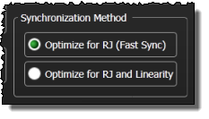 By default, precision timebase synchronization optimizes for RJ (Random Jitter) only. This provides a fast synchronization that is suitable for analysis of most signals. Optionally, you can choose to optimize both for RJ and for timebase linearity. This type of synchronization takes much longer but results in an extremely linear timebase as well as the lowest possible RJ. This type of synchronization is suggested for signals with extremely low DJ (Deterministic Jitter), where the signal rate is a multiple of the precision timebase reference frequency. For example, if your Symbol Rate is 32 GBd while your precision timebase reference frequency is 8 GHz, this option may improve the accuracy of the DJ measurements.